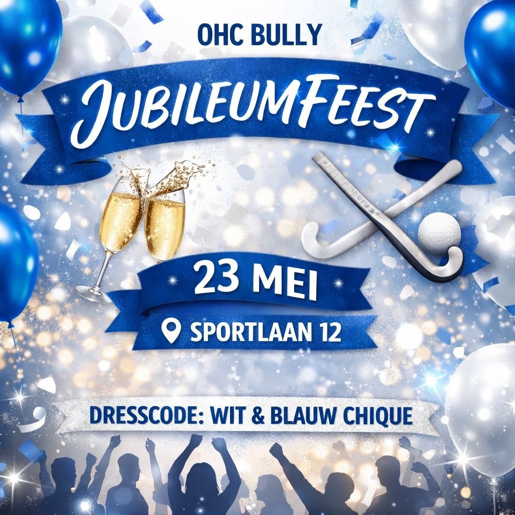 Dit jaar vieren we een bijzondere mijlpaal: het jubileum van OHC Bully! En dat laten we natuurlijk niet ongemerkt voorbijgaan… We nodigen jullie allemaal van harte uit voor een geweldig jubileumfeest, waar we samen herinneringen ophalen, nieuwe herinneringen maken en vooral genieten van alles wat Bully zo bijzonder maakt. Voor wie? Voor écht iedereen die Bully een warm hart toedraagt: van de jongste jeugdteams tot de senioren, van huidige leden tot oud-leden, en natuurlijk ook onze vrijwilligers en sponsoren. Dit feest is voor ons allemaal Het zou fantastisch zijn om zoveel mogelijk teams compleet te zien verschijnen, zodat we er samen één groot Bully-feest van kunnen maken. Dus trommel je teamgenoten op, app je oude hockeymaatjes en zorg dat je erbij bent! Wat kun je verwachten? Gezelligheid Muziek & feest Herinneringen ophalen